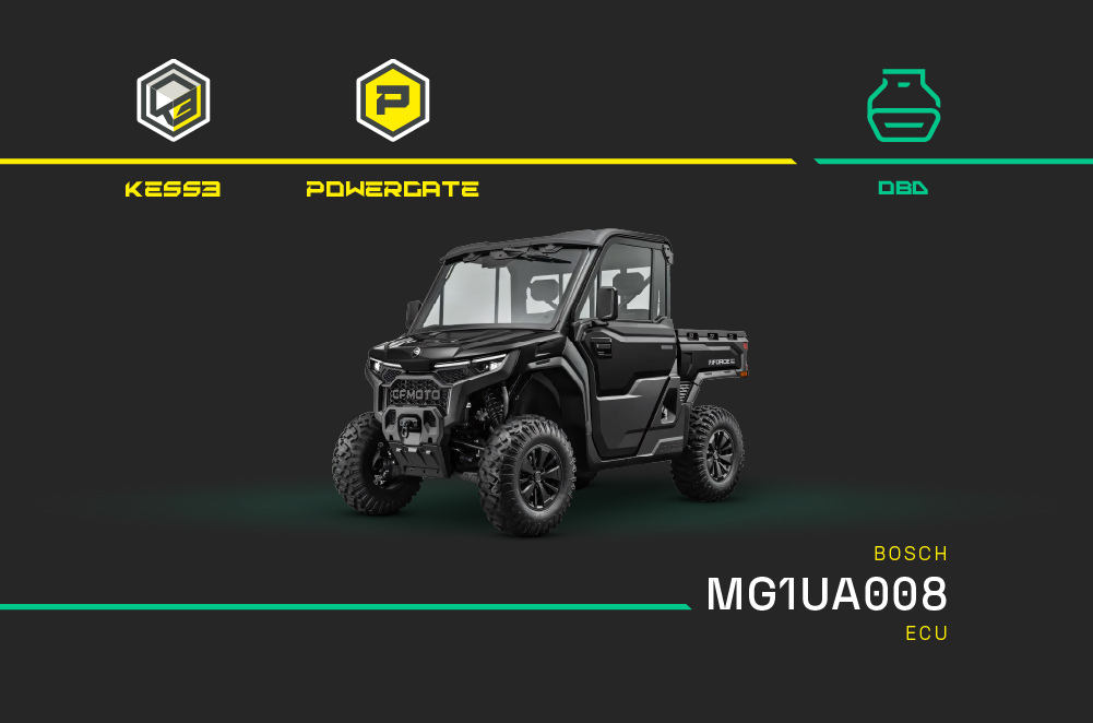 Ab sofort kannst du mit KESS3 im OBD-Modus an den neuen CF Moto UForce CF1000UTR-8 arbeiten, die mit einer Bosch MG1UA008-Steuerung und einem 1000cc-Motor ausgestattet sind – produziert ab 2025. Lese und schreibe das Steuergerät direkt über den Diagnosestecker – ein echter Vorteil für Werkstätten, die schnell an Fahrzeugen arbeiten, die für extreme Bedingungen, schwieriges Gelände oder Offroad-Einsätze entwickelt wurden und ihren Kunden die Möglichkeit bieten, Leistung, Drehmoment und Ansprechverhalten des Motors zu optimieren. Das neue Protokoll ist auch auf Powergate verfügbar und ermöglicht es deinem Kunden, die Neuprogrammierung seines ATVs eigenständig, sicher und direkt von der heimischen Garage aus durchzuführen. Technischer Fokus Verbindung: OBD VR ECU: Bosch MG1UA008 Produktionsjahre: ab 2025 Marke: CF Moto Unterstützte Fahrzeuge UForce CF1000UTR-8