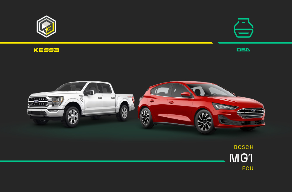Moderne Ford-Benzinmotoren – EcoBoost, Mild-Hybrid und Hochleistungsvarianten (Raptor) – nutzen Bosch MG1-Steuergeräte mit komplexer Softwarelogik, integrierter Hybridsteuerung und fortschrittlichen Turboregelstrategien. Mit diesem Release ermöglicht KESS3 auch auf diesen Plattformen den direkten OBD-Zugriff und öffnet damit den Zugang zur neuesten Generation von Ford-Benzinmotoren. Von kompakten Mild-Hybrid-Modellen bis hin zu leistungsstarken Turbo-Konfigurationen und großen V8-Motoren für professionelle Anwendungen – Lesen und Schreiben erfolgt unkompliziert über die Diagnoseschnittstelle. Technischer Fokus Verbindung: OBD ECU: Bosch MG1CS016 GEN II Bosch MG1CS040 Bosch MG1CS055 Bosch MG1CS060 Baujahre: ab 2017 Marke: Ford Unterstützte Fahrzeuge Ford Ecosport, Fiesta, Focus, Kuga, Puma, Transit Connect, Transit Courier, F-250 Super Duty, F-350 Super Duty, F-450 Super Duty, F-550 Super Duty, F-650 Super Duty, F-750 Super Duty, Ranger, Bronco, C-Max, Edge, Escape, Explorer, Maverick, Mondeo, F-150.